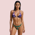 The top features a timeless sliding triangle silhouette with delicate ties around the neck and back, allowing for a fully adjustable and customized fit. It boasts a stunning abstract print in rich tones of purple, blue, and magenta, giving the look of a modern, artistic tie-dye or watercolor design.