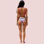 The top is designed with wide, supportive straps for a secure and comfortable fit, whether you’re lounging by the pool or enjoying the waves. While the main focus is the polka dot top, it is styled here with a contrasting, low-rise bottom featuring a multi-color floral/abstract print (not included with the bra) that perfectly showcases the fun of mixed-and-matched swimwear.