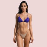 Designed for an optimal fit, this bikini bra features a fully adjustable halter neck and back ties, allowing you to customize the lift and coverage. The sliding triangle cups offer versatility in styling. While shown here with contrasting nude briefs, this stunning blue top pairs beautifully with matching bottoms or contrasting solids like white, black, or nautical stripes.
