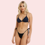 Make a dazzling splash in the Starlight Embellished Halter Bikini Top. This stunning triangle bra features a deep navy blue fabric, intricately detailed with small, sparkling diamantes or beads for a celestial, glamorous look. The classic halter neck and soft cups provide comfortable support and a flattering shape. Pair it with the matching bottoms for a truly radiant beach or poolside outfit.